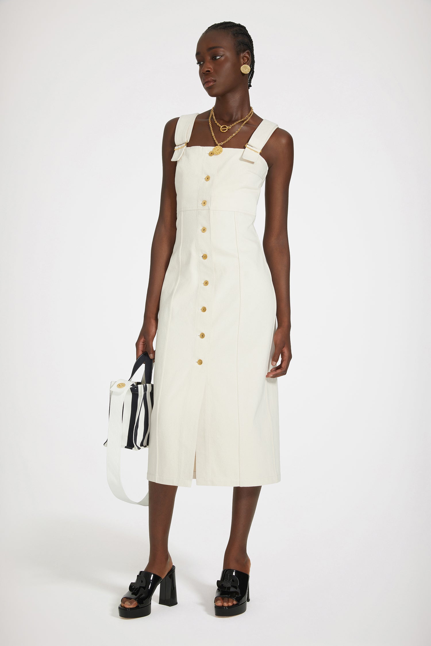 Ecru regenerated cotton denim dress. Knee length. Fitted silhouette. Wide dungaree straps with gold-tone hardware. Gold-tone Patou-engraved denim buttons.