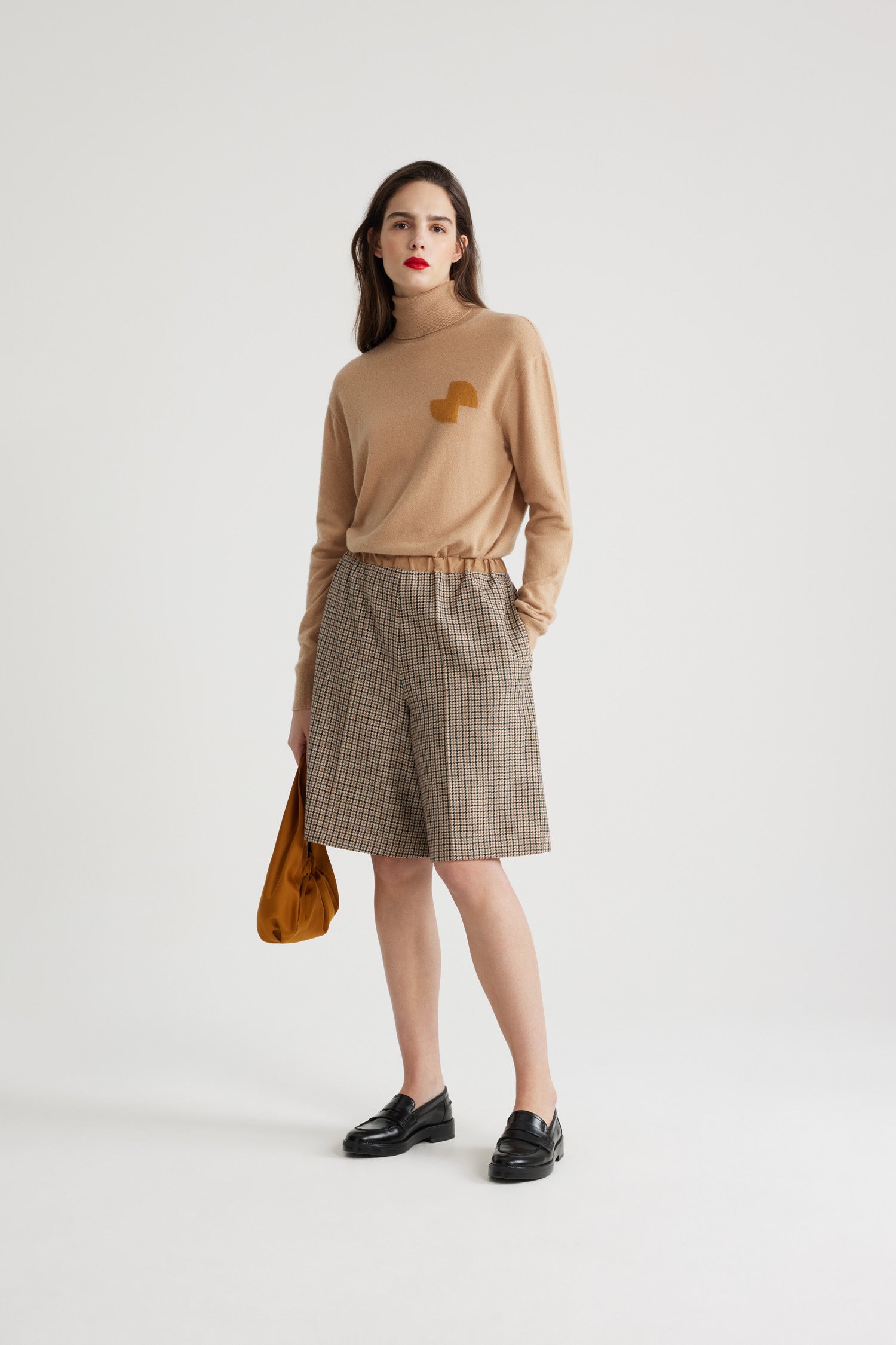 Recycled wool blend flannel shorts. Houndstooth pattern. Knee length. Elasticated waist. Contrast waistband. Two pockets at the sides. Pressed creases at the front.
