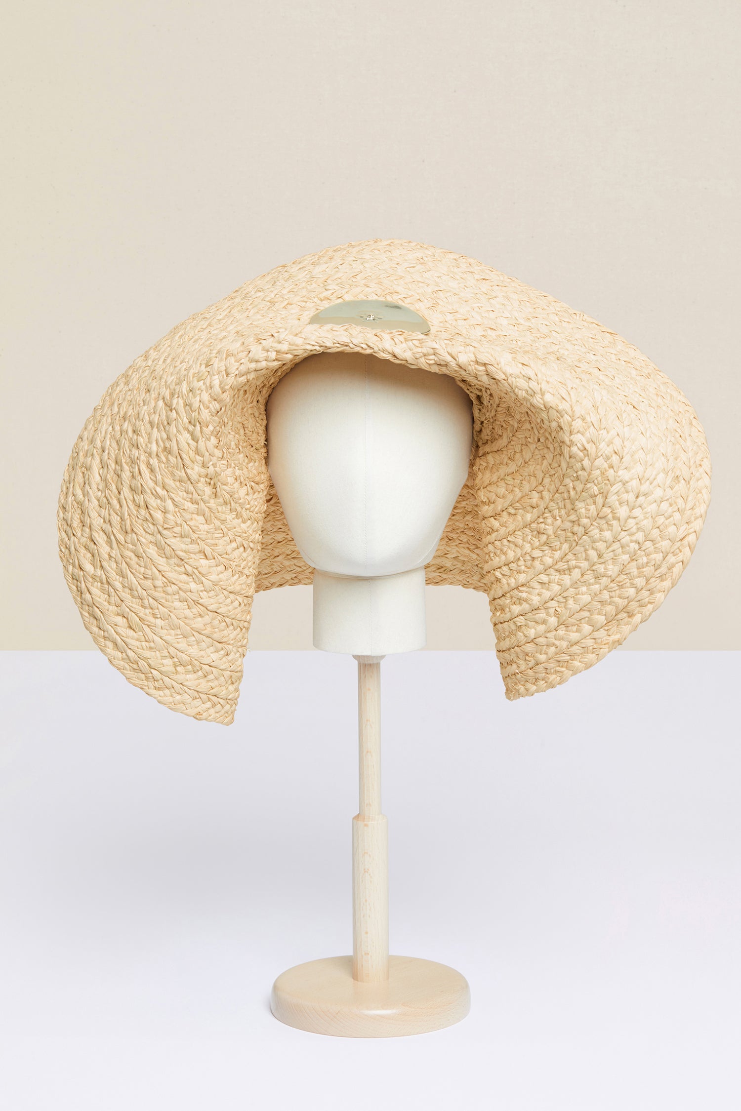 Oversized woven palm leaf hat. Wide turned up brim with a gold-coloured brass embellishment inspired by the “Bocca della Verità”.