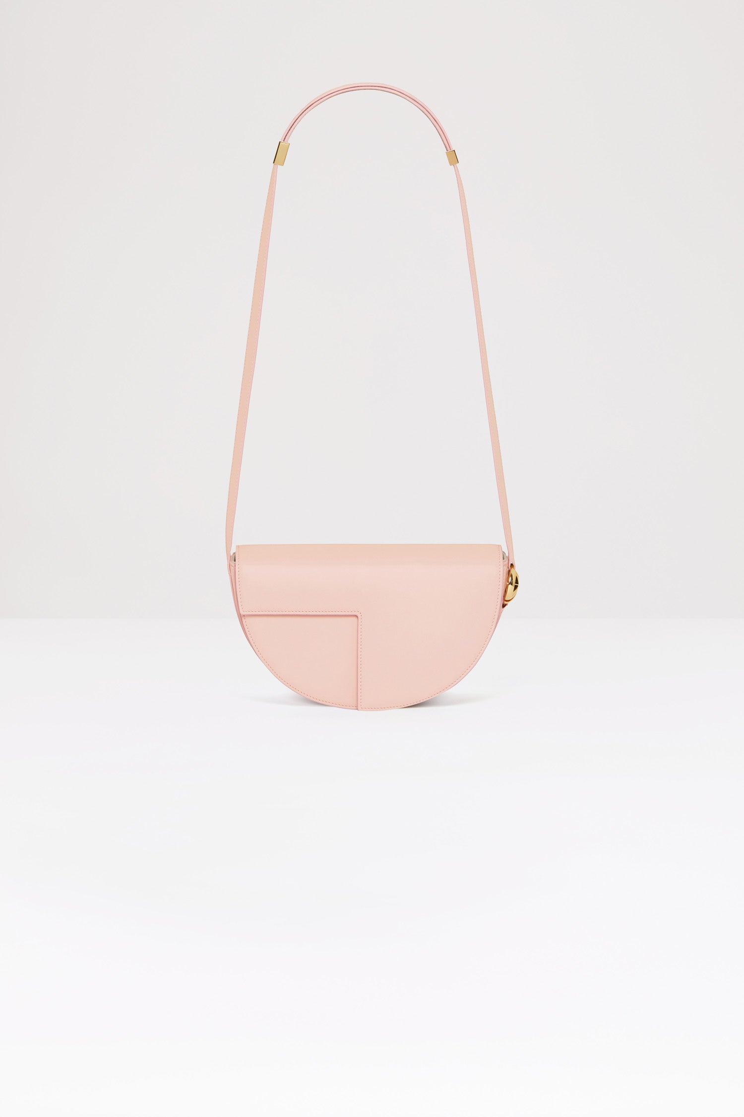 Powdery pink leather handbag. Crafted using unique materials sourced from unused high quality leather hides. 60 limited numbered edition. Half-circle shape with geometric cut-outs inspired by the JP monogram. Gold-tone hardware with JP monogram detail at the side. Adjustable strap that allows it to be worn on the shoulder, across the body or carried by hand. Magnetic closure with gold-tone JP detail. Multiple compartments inside.