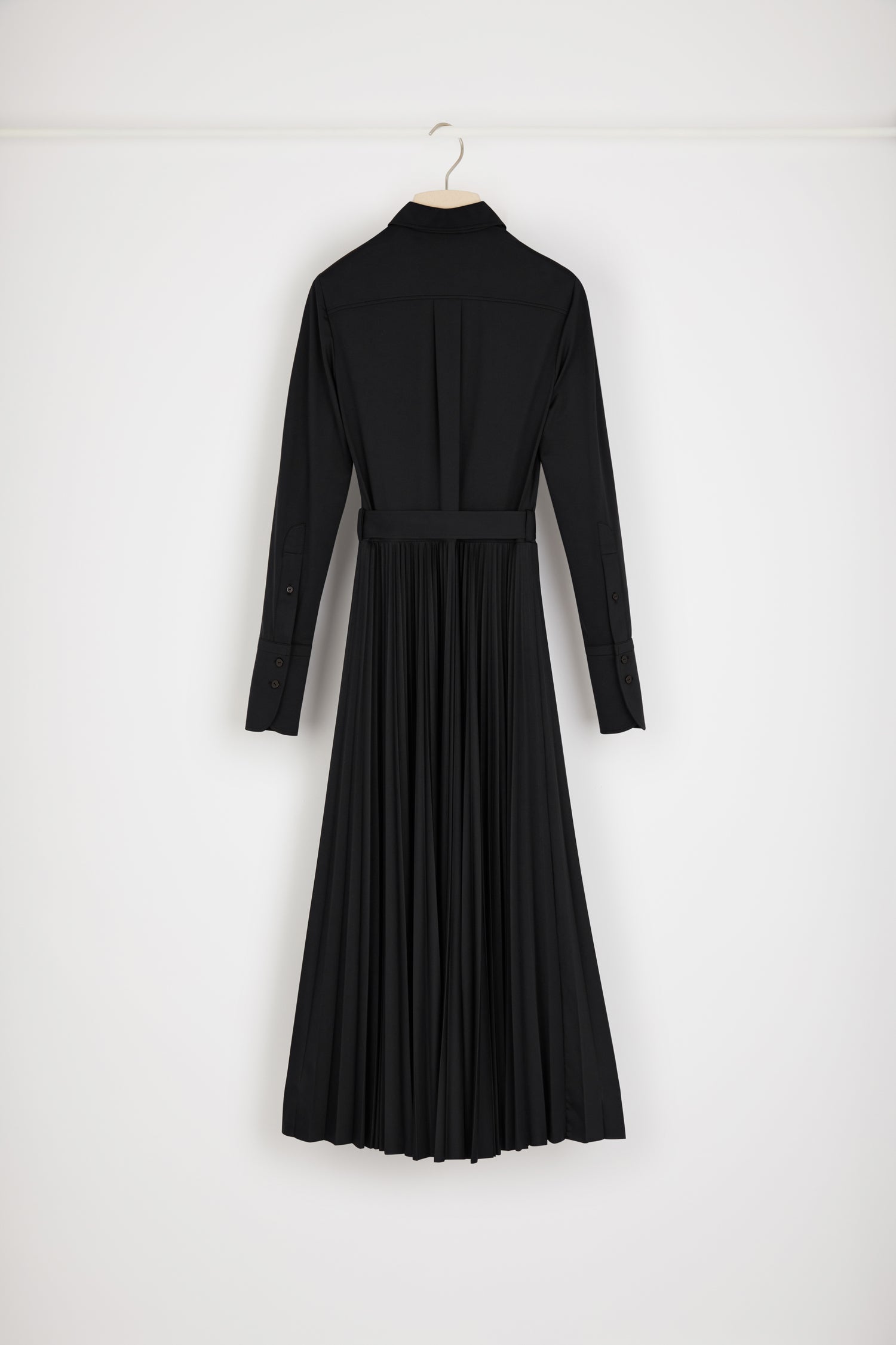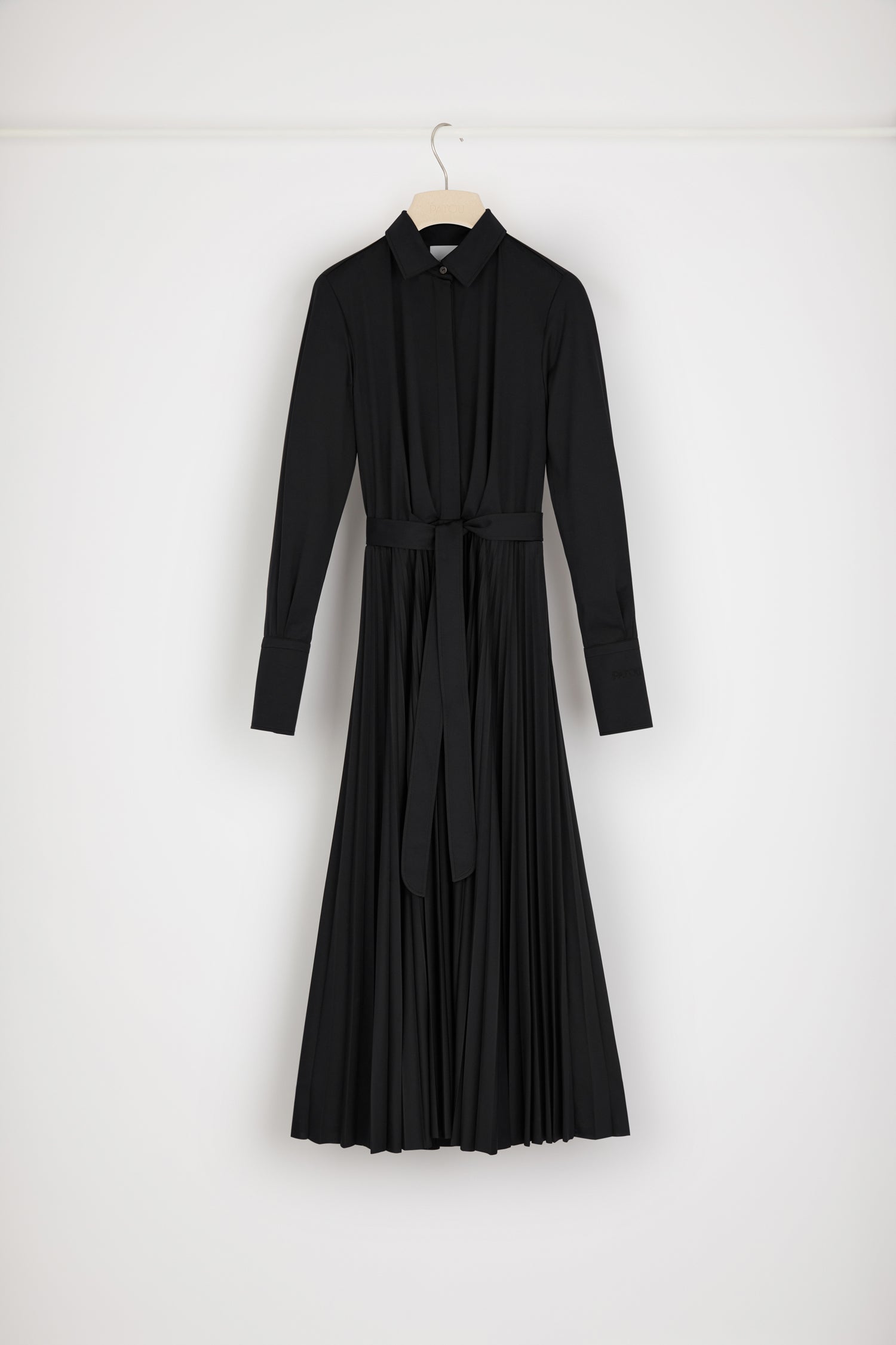 Black recycled polyester dress. Maxi length. Shirt collar. Concealed button fastening. Buttoned cuffs. Patou logo embroidered on the left cuff. Self-tie belt at the waist. Pleated skirt.